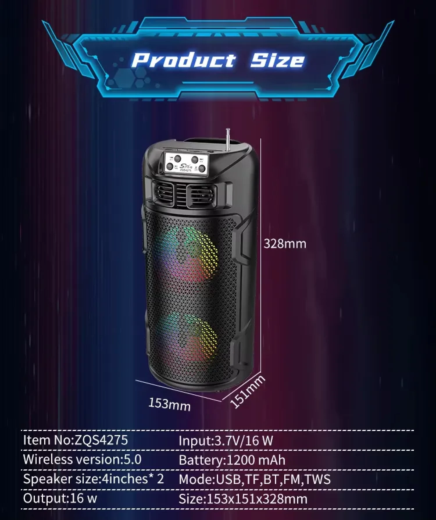 Functii: Bluetooth, Radio FM, USB, TF, TWS, Iluminare LED, Încarcare solara